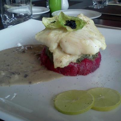 Un Pollo a la Marengo, delicado, muy atomatado con aceitunas enteras y champiñoñes, sobre un gratin de papas. Tambien un Blanquillo Pochado con salsa Normandia sobre un duo de pure (espinacas y betarragas).