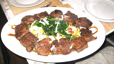 Ahora, no tendría gracia exponer todo esto si no se muestra un poco de inventiva, mi último plato es una interpretación un poco más moderna, con los mismos gnoquis de antes pero dorados, esta técnica es una nueva forma de dar un carácter diferente a este clásico producto. El plato es filete de res a la plancha con reducción de merlot, gnocchis de calabaza dorados en mantequilla al azafrán y queso de cabra. Primero blanqueamos una juliana de zapallo italiano y unos gajos de rabanito, reservamos, luego ponemos a reducir vino y caldo de carne con un poco de azúcar. Sellamos el filete por todos lados y luego llevamos al horno por unos 6 minutos. En un sartén colocamos mantequilla y unas hebras de azafrán (la calabaza y el zapallo se llevan muy bien con esta especia), luego ponemos a dorar los gnoquis en la mantequilla azafranada, cuando se forma una costrita dorada en cada uno agregamos los vegetales y terminamos con el queso de cabra.