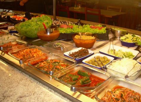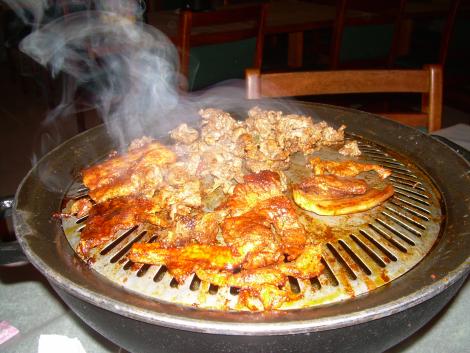 Cada mesa lleva una parrilla, donde se ponen a asar los cortes de carne con aliños coreanos: contrafilé, chunchul coreano (mismo sabor que el que comemos acá pero sin trencita), pollo, chancho, tocino y otras más que están en el mesón así: