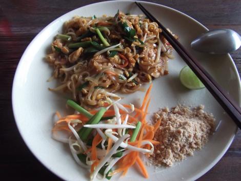 Entre la dificultad de lidiar con el idioma, el calor y las diferencias culturales, comenzó el  gran tema comidas, desde el primer día. Pedi Pad Thai,mezcla de fideos de arroz, pollo, huevo, verduras, todo salteado y por supesto muy condimentado, pero lo pedi sin picante y todo bien. Segundo día dije, ok, hay que probar la comida tal cual como ellos, intente comer una sopa Tom Yum, fue imposible, la cantidad de picante me hizo llorar, estar todo el día bebiendo agua como loca y sentir la boca hinchada como un verdadero pescado. Tercer día comida thai pero pedí solo con un poquito de picante, no resulto, tremendamente picante de nuevo, ya no sabía que hacer. Durante ese mismo día compartí con un policia tailandes que hablaba algo de ingles, le conté mi problema y me dijo entre risas: "debes pedir pedir sin picante, para que sea algo picante y aceptable para tí y adémas tener leche a mano que es lo unico que calma el ardor". Asi que al día siguiente le hize caso y pedí un plata sin picante, y al fin, resultó!!! picante!!! pero soportable!!! jajaja.