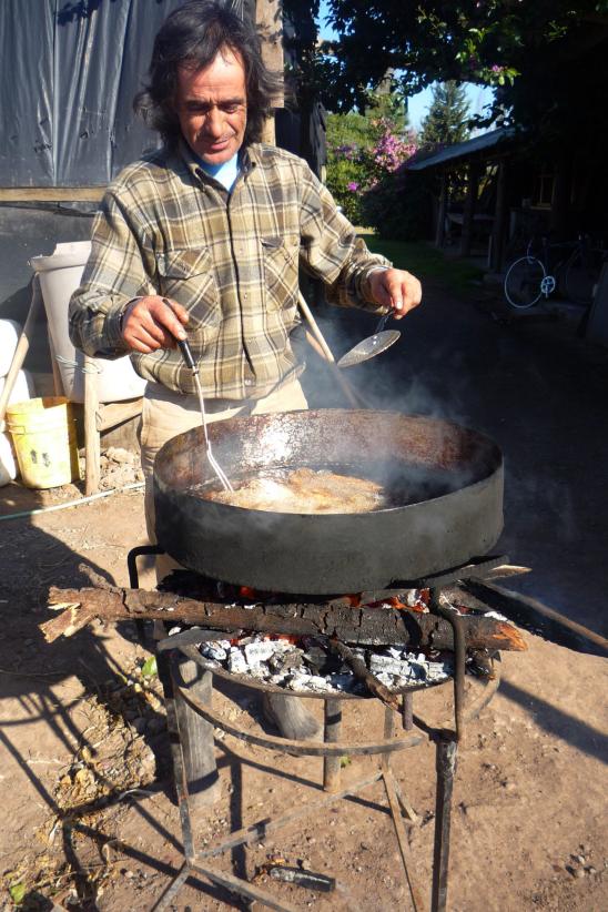 Seguimos esperando con buena conversa, mucha talla, historias contadas durantes 20 años, bastante licor de ave( versión pelolais del jote) Hasta que el aceite ya no chicharreaba y Don Teco pide a sus ayudantes una bandeja de lata con papel absorbente y a comer...