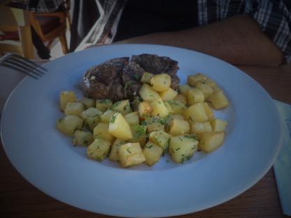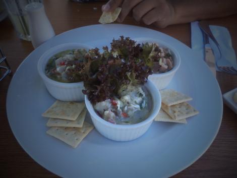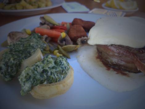 Hoy fuimos a almorzar al restaurant Tierra del Fuego, ubicado cerca del muelle vergara. Al llegar nos ubicaron de inmediato en la terraza del segundo piso con vista al mar. El garzón (Felipe) llegó al segundo trayendo las cartas y ofreciendo un aperitivo, yo me tomé un kir royal ($2400) y mi pareja un jugo de piña los cuales llegaron al par de minutos. Para comenzar probamos una trilogía de ceviches ($6500) de salmón, corvina y reineta, los tres frescos y con el aliño preciso. Como plato principal elegi un filete tierra del fuego envuelto en tocino, que traía queso de cabra gratinado encima, salsa de 3 pimientas y acompañado por papas duquesas, vegetales salteados y dos fondos de alcachofas rellenos con espinacas a la crema ($9.800). Los sabores combinaban perfectamente y las porciones eran bastante generosas. Mi pareja pidió un lomo vetado ($8000 aprox.) con papas salteadas al ajillo, el punto de la carne era preciso y las papas estaban crujientes y sabrosas.