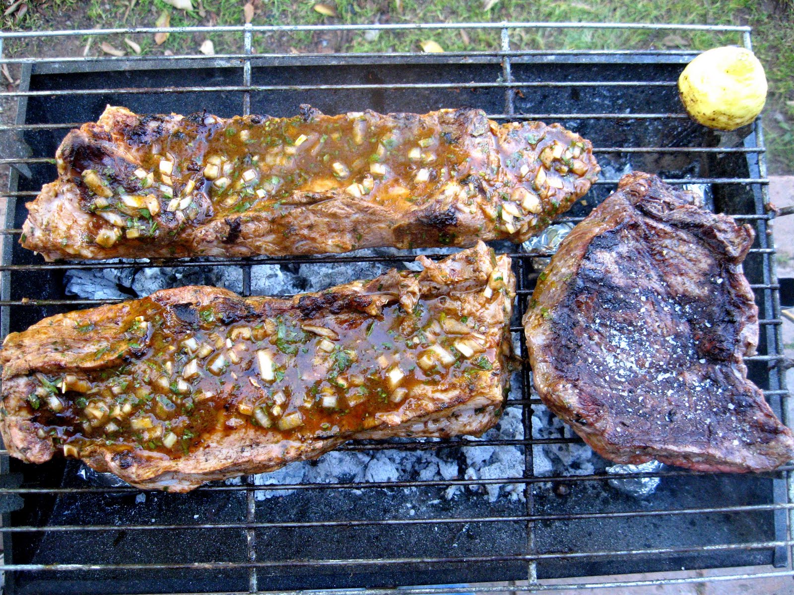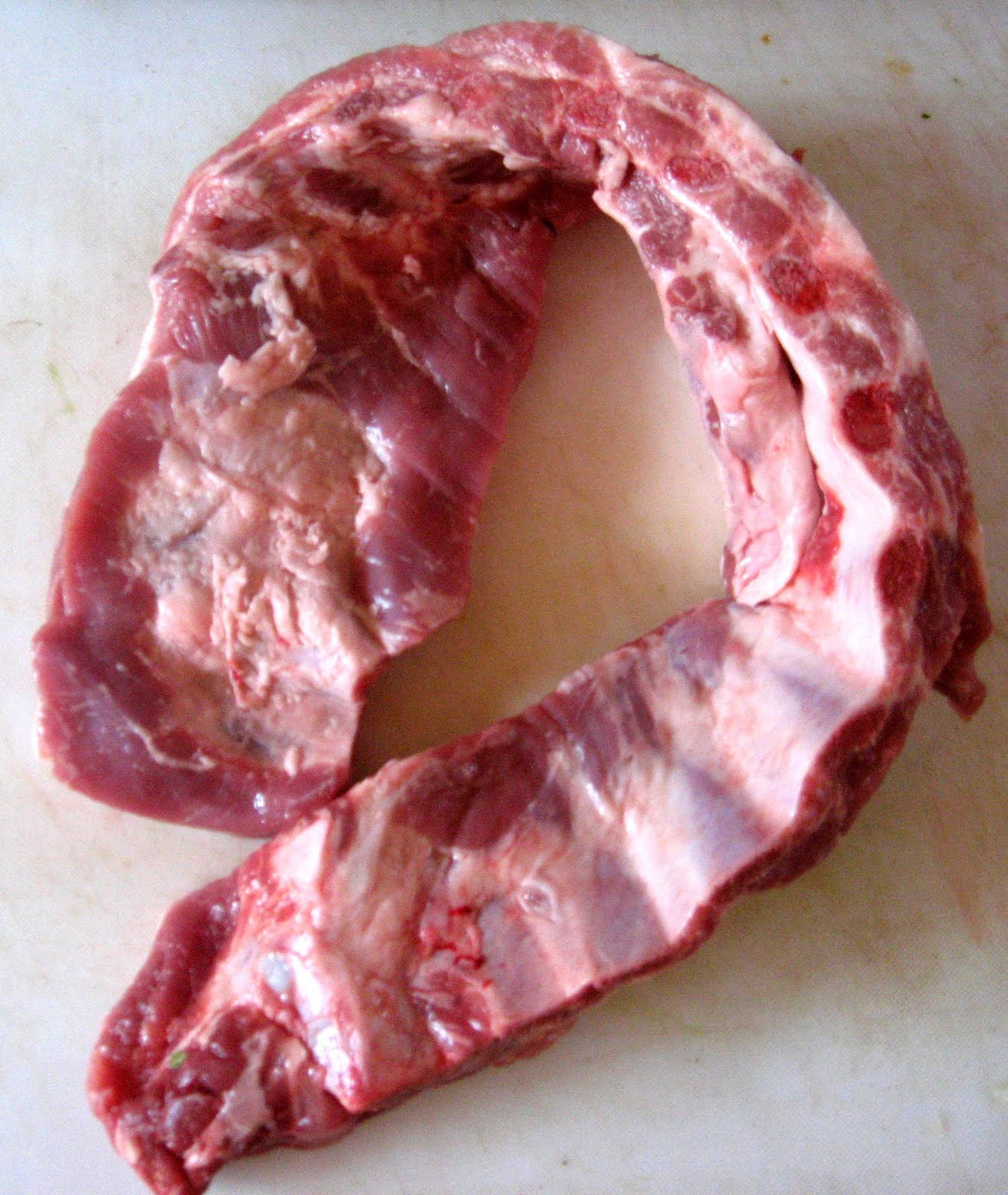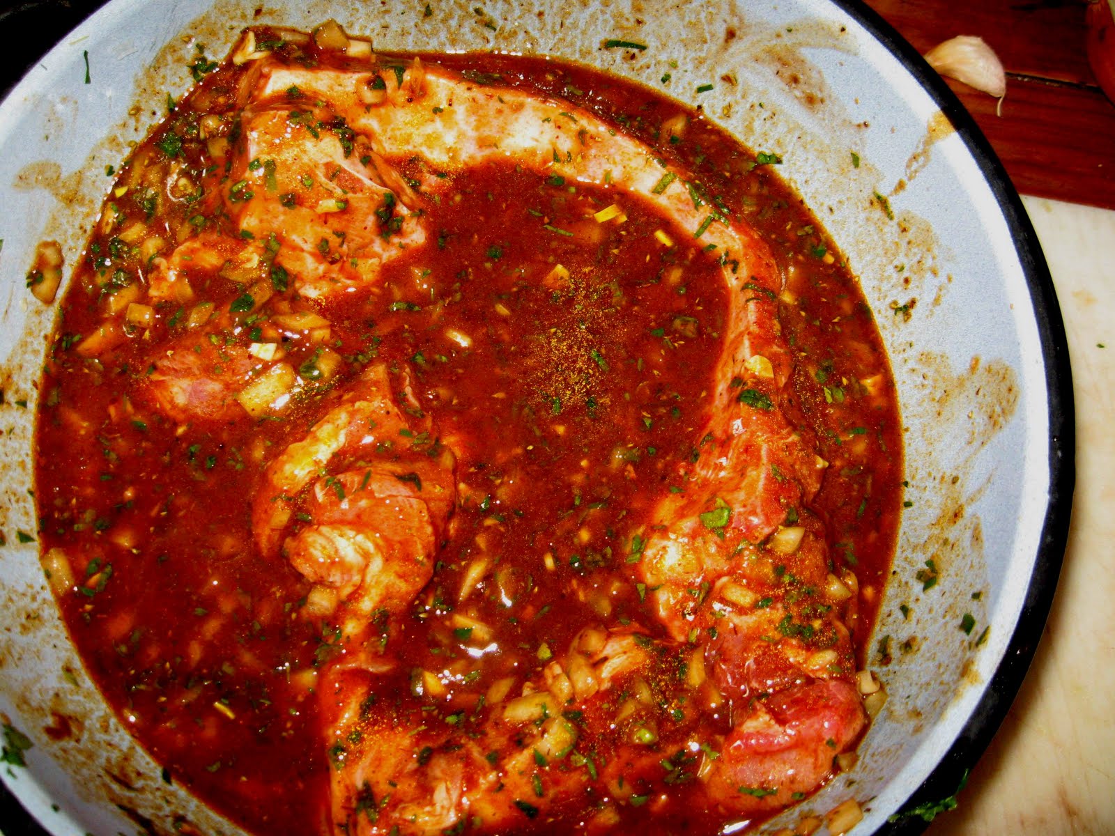 Tenemos nuestra marinada lista, picante, ácida, olorosa. Personalmente me gusta agregar merkén, para darle sabor a Sur. También tenemos nuestro costillar, lindo y grasoso.