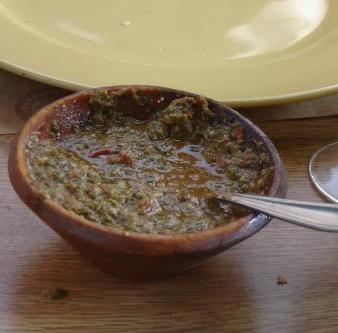 Primero, mientras decidíamos nos trajeron pebrecito y pan. Delicioso, con harto orégano y otros aliños. Es un pebre no picante pero muy rico, diferente.