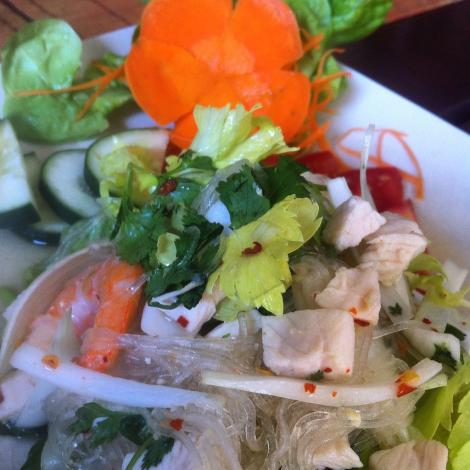 Partimos con una ensalada Yam Woon Sen ($5.500) con fideos transparentes de porotos, camarones y trozos de pollo, además de una salsa thai picante. Una ensalada picante llena de sabores diferentes. Una gran opción para los que estan cansados de la lechuga o no quieren comer algo demasiado pesado, pero con sabor.