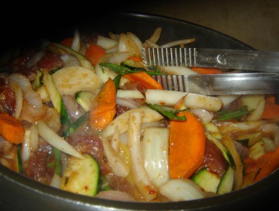 Mientras comíamos lo que podíamos, de verdad que hice esfuerzos con el famoso kemchi pero no pude, nos traen la parrilla y tras calentarse ponen la mezcla de calamares, carne de res y verduras varias. Antes de traernos las cosas nos preguntan qué tan picante lo queríamos y dijimos "medio... no tan picante..., tras cocinarse en la mesa debo decir que era rico pero muy picante o no se respetó lo solicitado o los umbrales de picor son muy diferentes. Al parecer le agregan un condimento que lo deja muy picante y agridulce (cosa que a mi sra. no le gusta para nada).